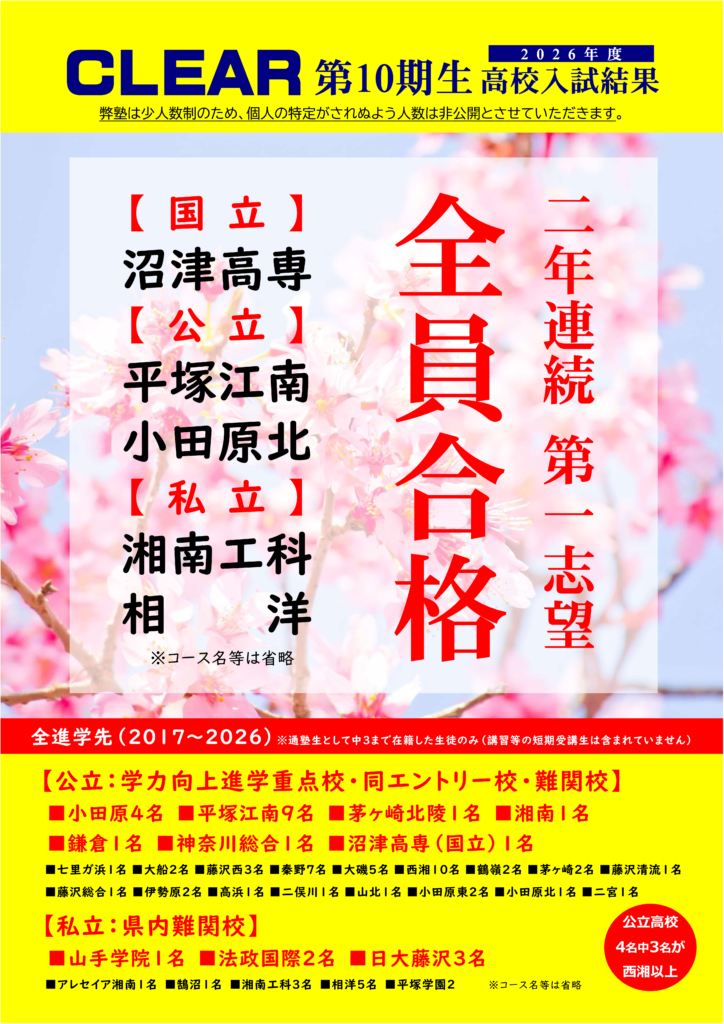A: 国府津中学校区を中心に、酒匂中学校・橘中学校などの近隣公立中学校のお子様も歓迎しております。 これまでは国府津中専門としていましたが、近年の入試傾向の変化に伴い、中学校ごとの対策よりも「本質的な学力」が問われるようになったため、学区を問わず受け入れを拡大しました。 ※高校生は、通塾可能であれば学校を問わず対応いたします。
