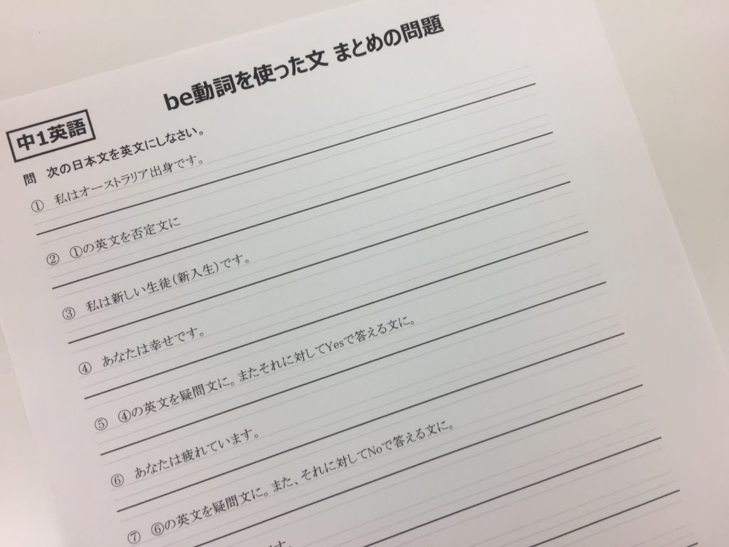 中1英語はI am~/You are~/This(That) is~を終え、be動詞の文のまとめへ。教科書の文法順序とは若干異なるが、定期テストまでまだゆとりがあるため、塾オリジナルのカリキュラムで進めている。