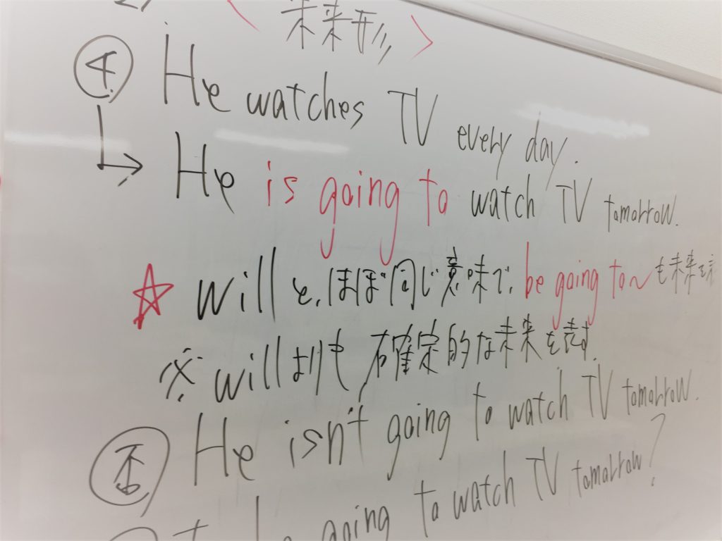 中2=進学資料に関わる学年=準受験生、に進級したことで、意識が変わってきているように思えてならない。「甘さ」が随分と目立たなくなってきた。そんな中2生であるため、今日は英語を一段階テンポアップして進めた。「未来形」を一気に。これまでは、子どもたちの理解度から、1回目で助動詞willの用法を、2回目でbe going toの用法を、という具合に、未来形は2回に分けて進めてきた。けれども、今日はそれらをまとめてドン!だ。助動詞canを思い出させつつwillから始め、be going toへとつなぐ。そして、それぞれの微妙な違いを認識させたうえで、多くの子どもたちが間違えやすいbe動詞を絡めた未来形までの練習で完結。かなり速いペースで進めたため、理解できているかどうか心配だったが、問題演習の時間を数分設定して取り組んでもらったところ、ほぼほぼ大丈夫と判断。100%に持って行くのはテスト前でOKだ。