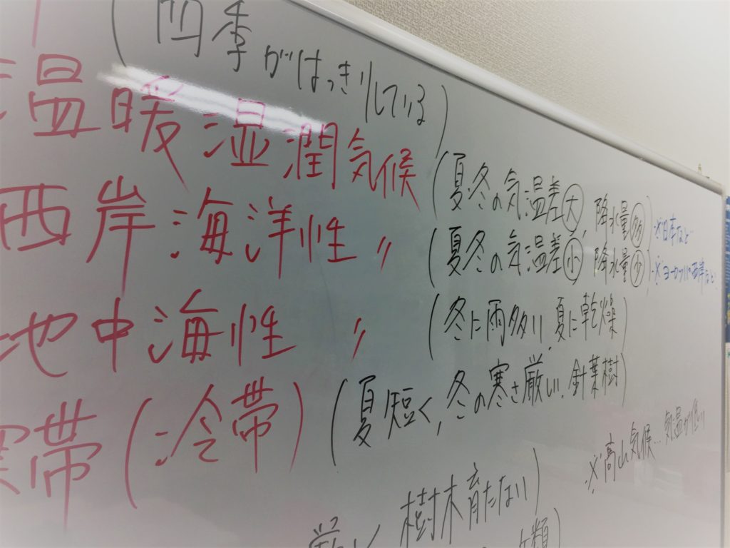 地理は世界の気候の確認。まずは5種類の気候帯から。その後それぞれの気候区分を説明。温帯に属す3つの気候はややこしいため、少し時間を割いてじっくりと。季節風や偏西風に触れながら「なぜ?」を大事に進めた。高山気候の特徴までを説明し地理はひとまずフィニッシュ。