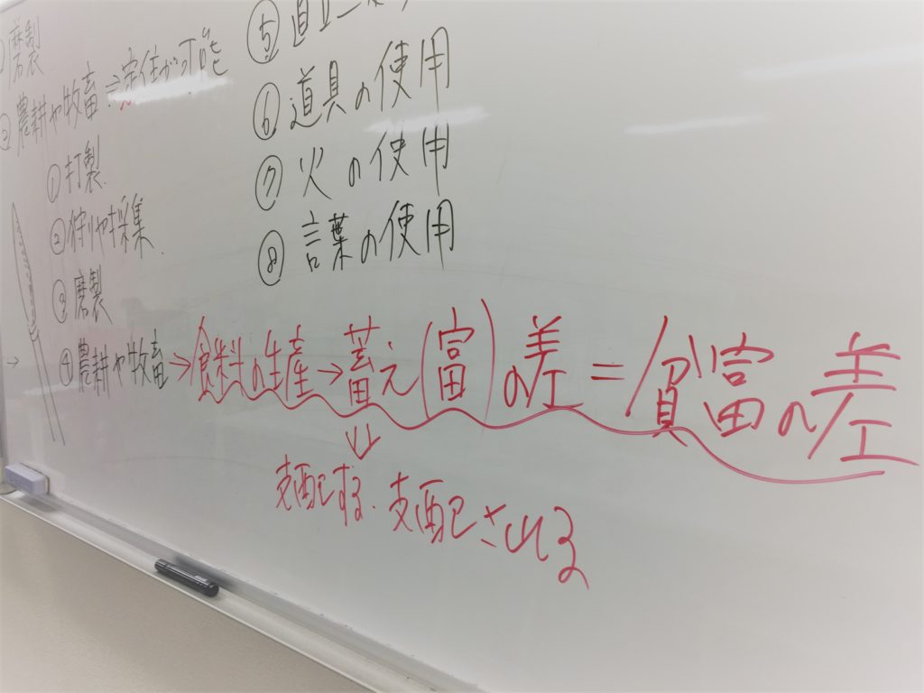 歴史は人類の発生から。旧石器時代と新石器時代の違いをできるだけ丁寧に。未だ文明も築かれていなければ、歴史上の有名人も出てこない時代だけに、「つまらない」「退屈」とならぬよう、「人類とは?」「狩猟採集生活から農耕牧畜生活への変化が何をもたらしたか?」など、地理同様に考えさせることに重きを置いて進めた。