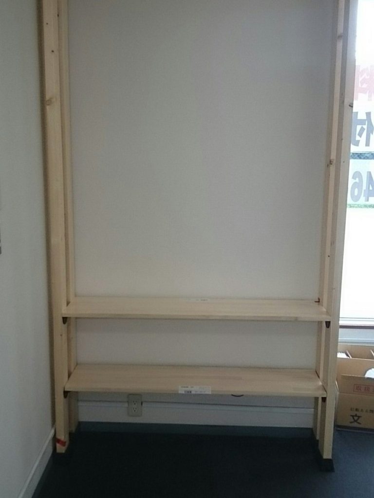 購入したのは2✕4材を4本、ディアウォール、横幅120㎝のパイン材を用意。2✕4材は床から天井までの長さにホームセンターでカットしてもらい、他は教室で全て組み合わせながら調整しました。焦ったのは少し2✕4材が短かったのか、少し不安定に・・・。あとから、スペーサーを購入して調整しました。※ディアウォールを使って同様のをつくってみようと思う方は、床がカーペットの場合は2✕4材を-4.5㎝でカットではなく、-4㎝でカットにした方がよいです。カーペットの沈み込む分を計算していませんでした。
