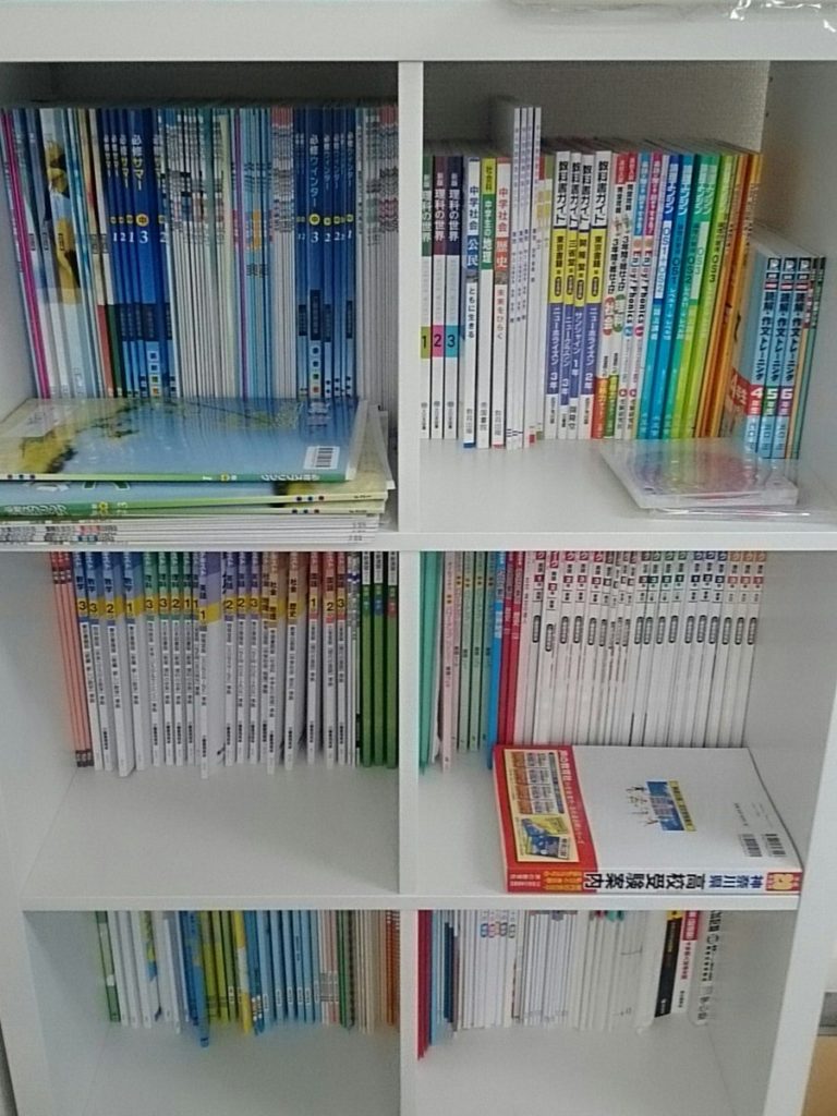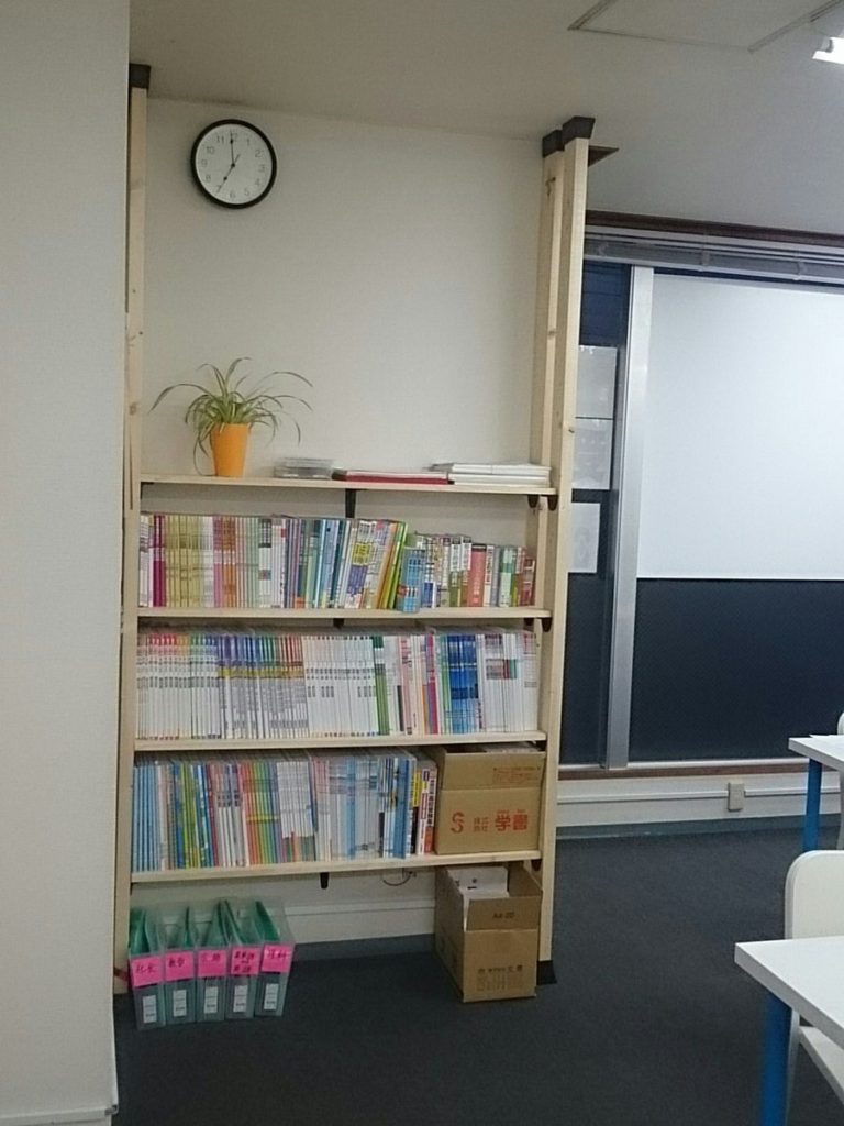 開校当初に購入した本棚が、テキストや参考書、教科書などでいっぱいに・・・。