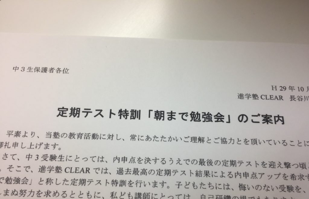 何としてでも結果を求めたい。ならば、トコトンやる。「朝まで勉強会」の実施を決めた。前職時代には十数回行ってきたこの勉強会、CLEARとして実施するのは初。中3通常授業後から翌朝の7時までの突貫勉強会。