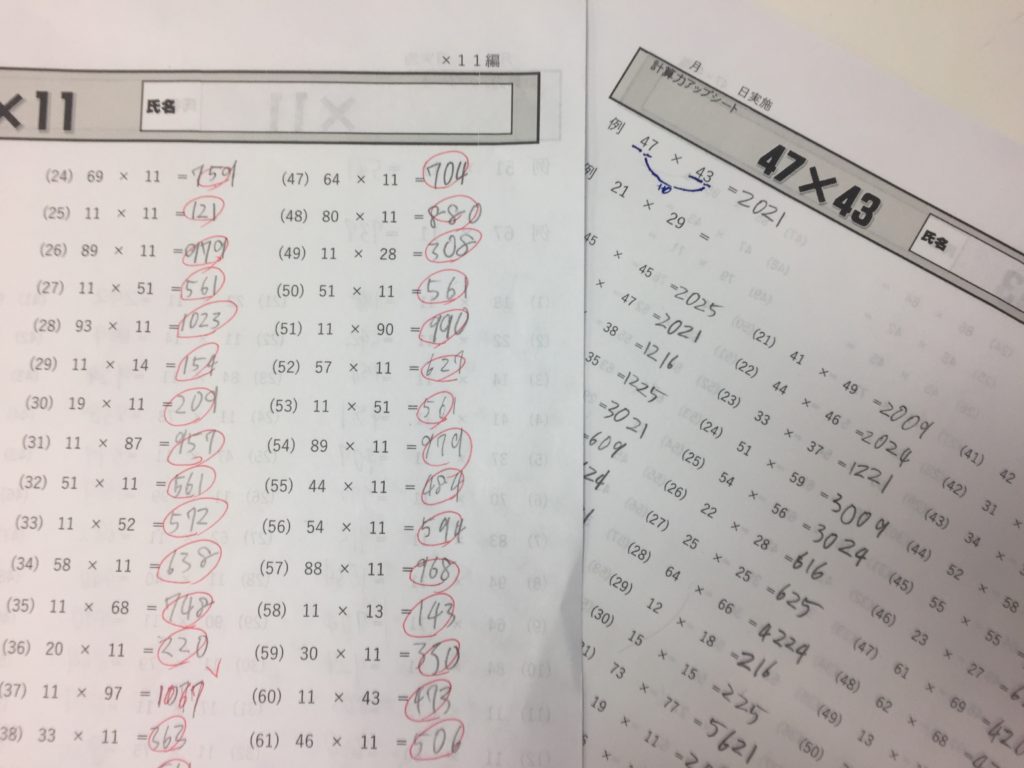 今のところ、写真にもあるとおり、筆算をした形跡がないことから、二桁×11、二桁×二桁(二桁が同じ数字)までは、子どもたちはスラスラと暗算で解けるようになってきている様子。