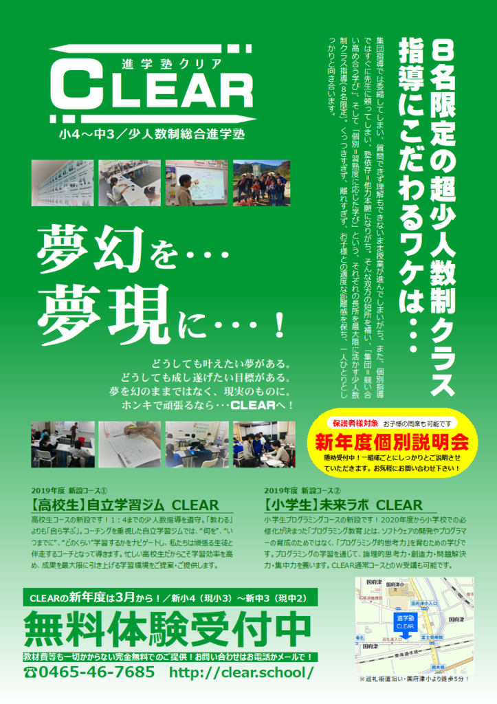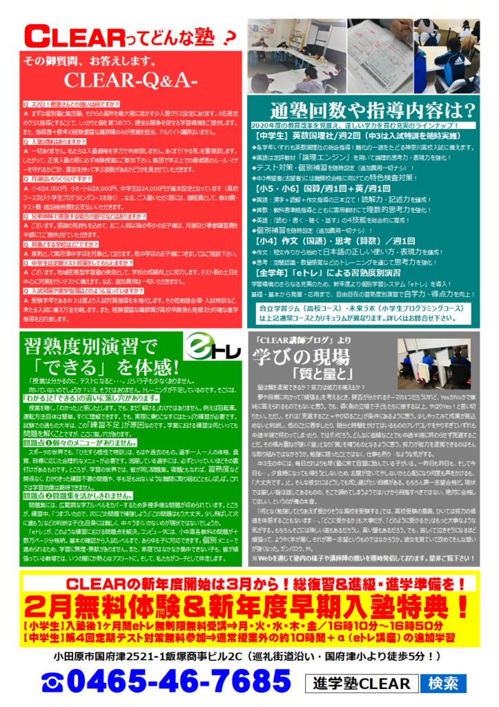 本日1/19(土)、国府津周辺の皆様に向け、チラシを新聞折り込みさせていただいております。塾をご検討中の皆様にご覧いただければ幸いです。新年度に向けた新しい取り組みも書かせていただいております。