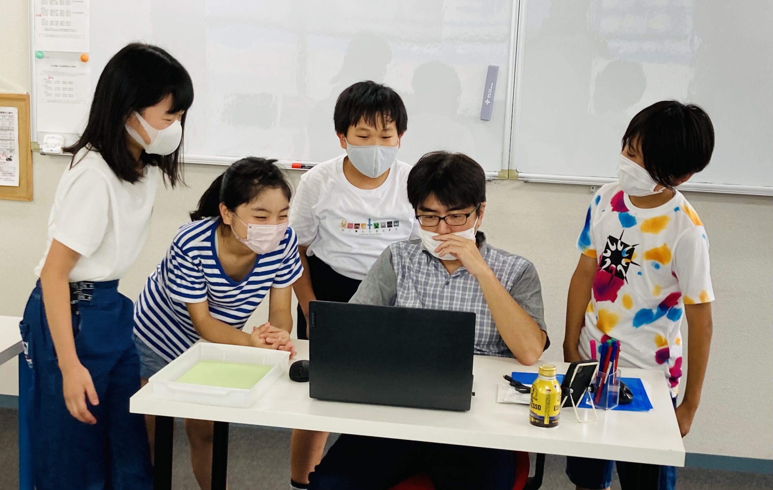 開始前の一コマ。何やらパソコンの画面に見入る子どもたちと武山T。