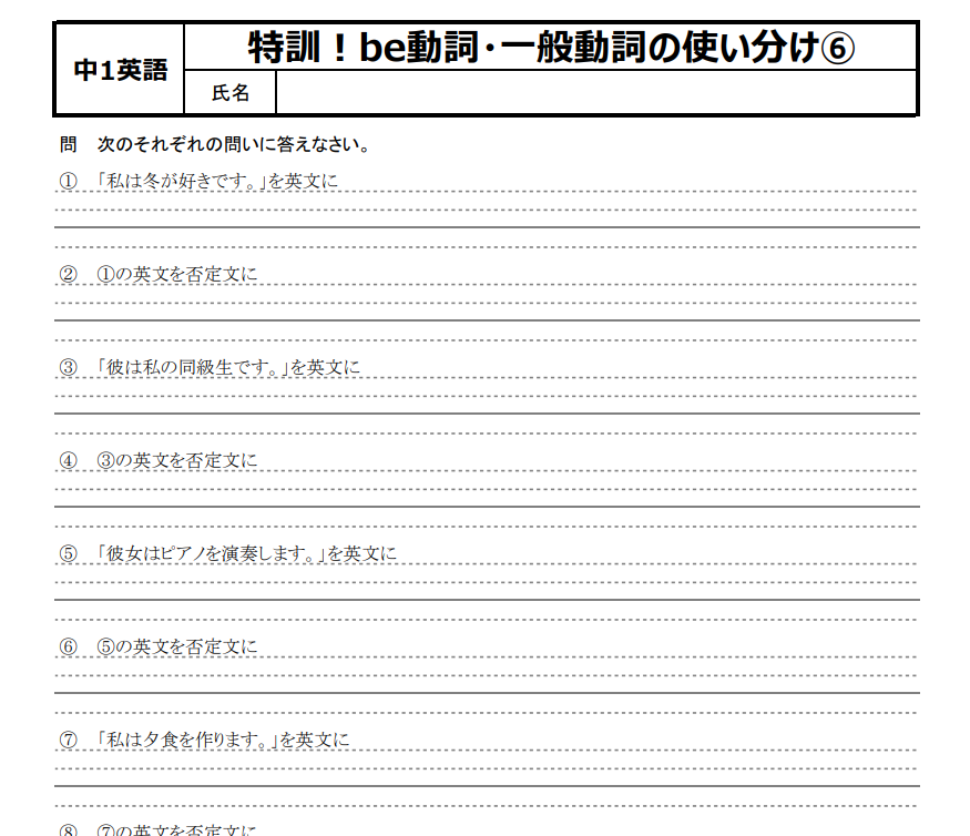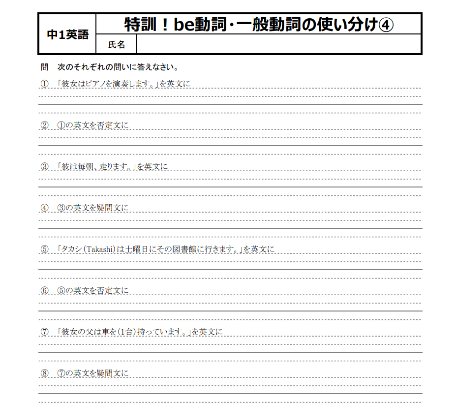 秋冬にかけて登場してくるのが、一般動詞の三人称単数現在形。playsだのdoesだの原形だのと、この辺から英語が苦手になったなんて子もいるだろう。そう、まさに、中1英語における分岐点の一つだ。be動詞と一般動詞との区別すらままならない状況であればなおのことだろう。ワカラナイ⇒ヤラナイ⇒デキナイの悪循環が始まってしまう。でも、それを断ち切るには、少々面倒だろうが苦しかろうがなんだろうが、ここ一番頑張らなければだめだ。今まで“放置”してきてしまってたツケを返すには、今までと同じことをしていても何も変わらない。勉強に限らず、仕事だってなんだってそうだろう。