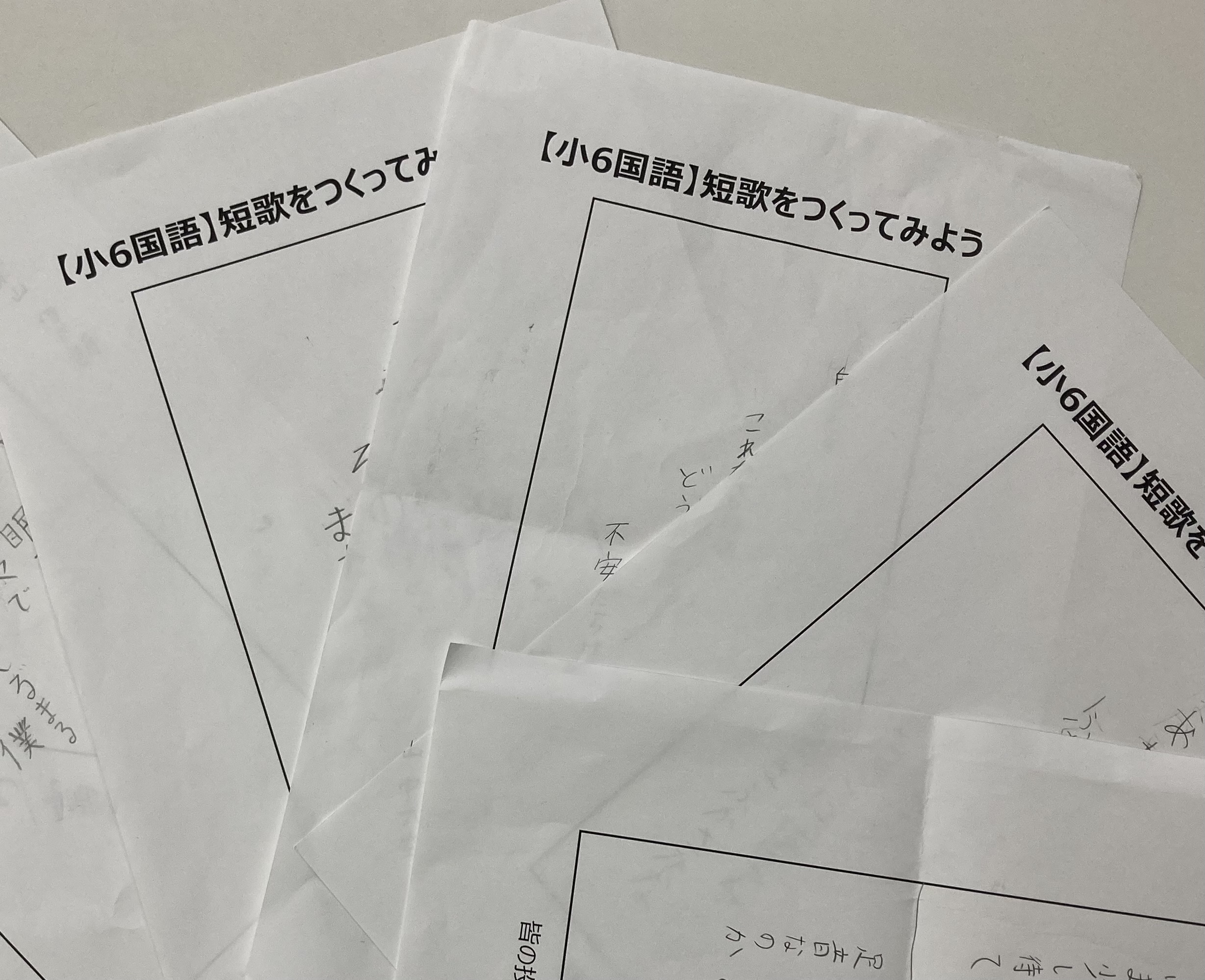 小6は前回の宿題・オリジナル短歌を回収。次回投票により最優秀作品を決定する。子どもたちの作品はブログにも掲載予定(子どもたちには了承済み)!