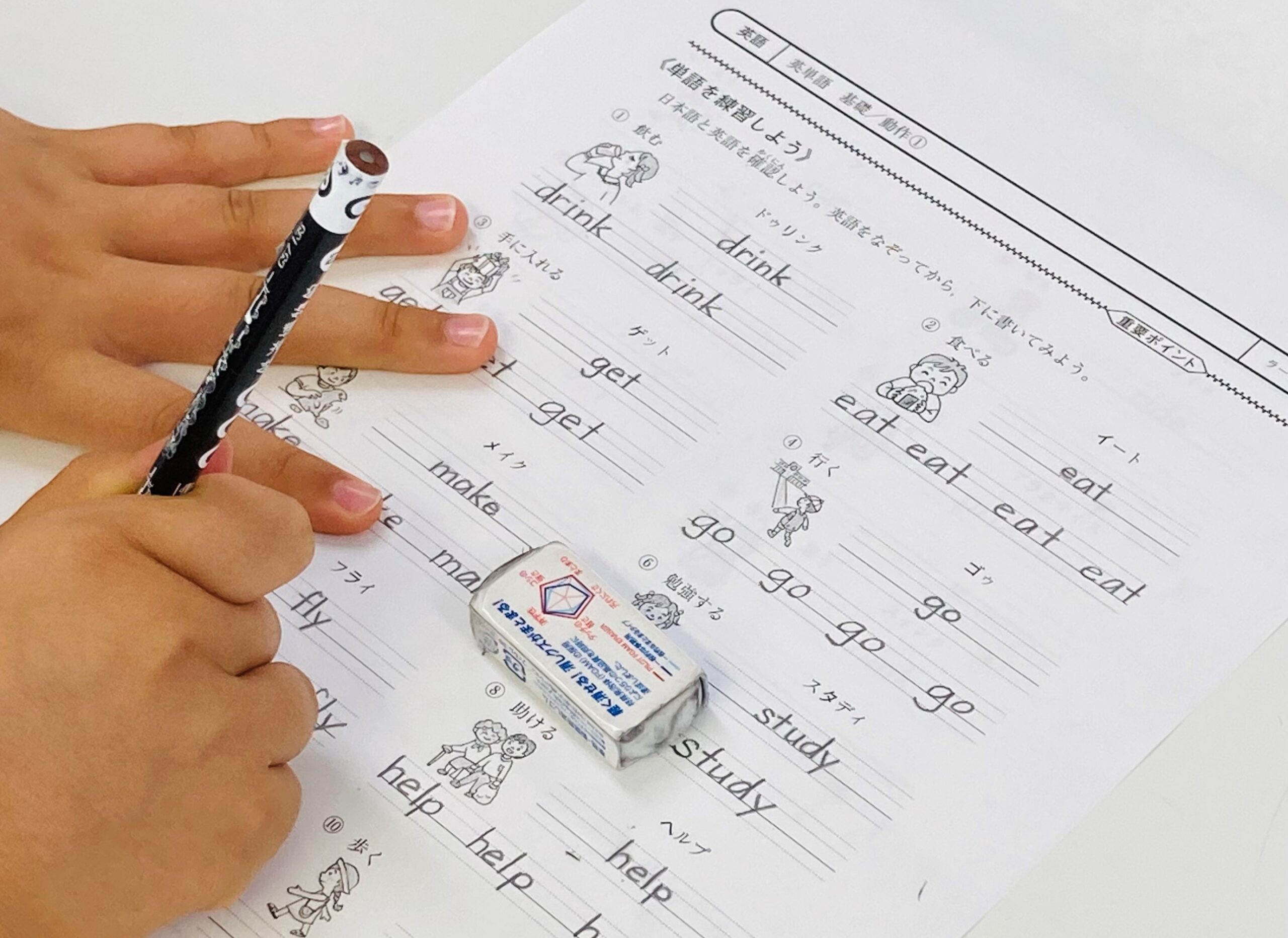 小学校ではつい後回しにされがちな「書く」にもキッチリと取り組む。「とにかく楽しく」だけのレクリエーションのような英語ではなく、中学進学以後を見据えて、しっかりと備えたいという方は是非。
