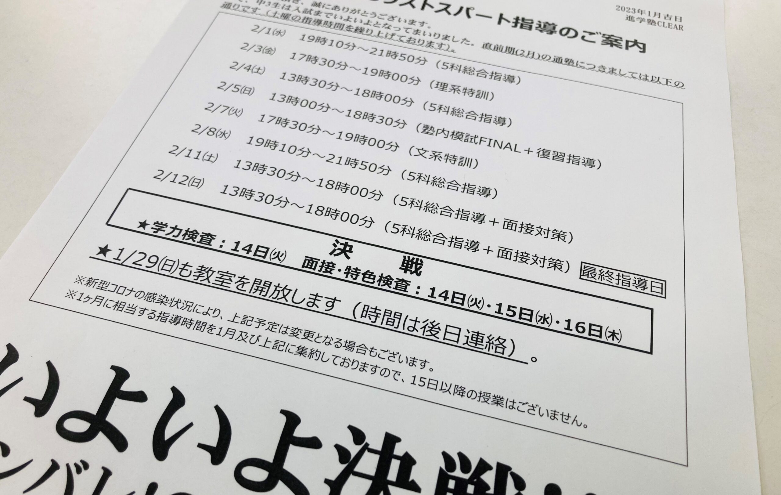 中3受験生の決戦(入試)まで1ヶ月を切った。子どもたちは皆、揺らぐことのない第一志望に向けての想いを胸に邁進中だ。