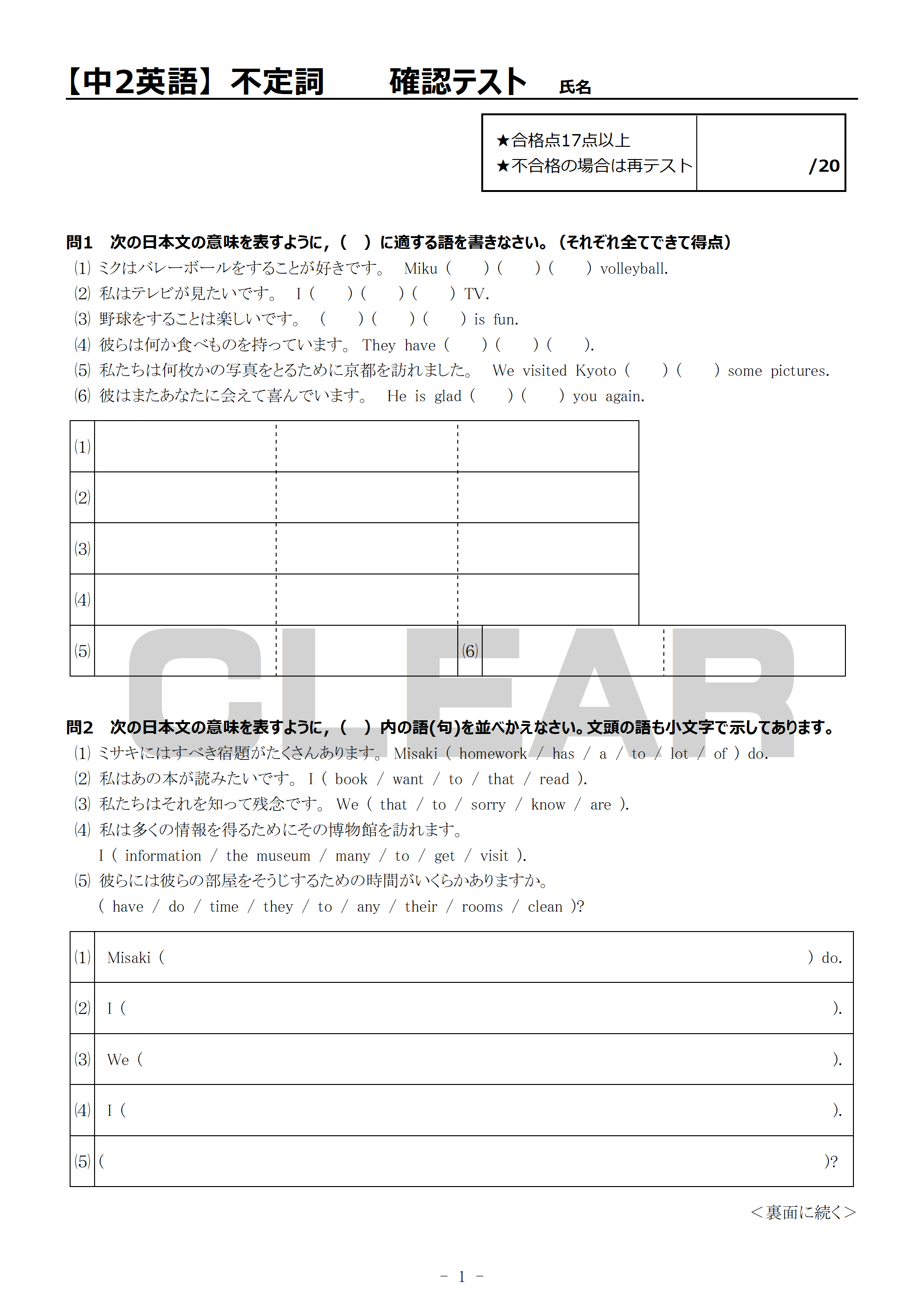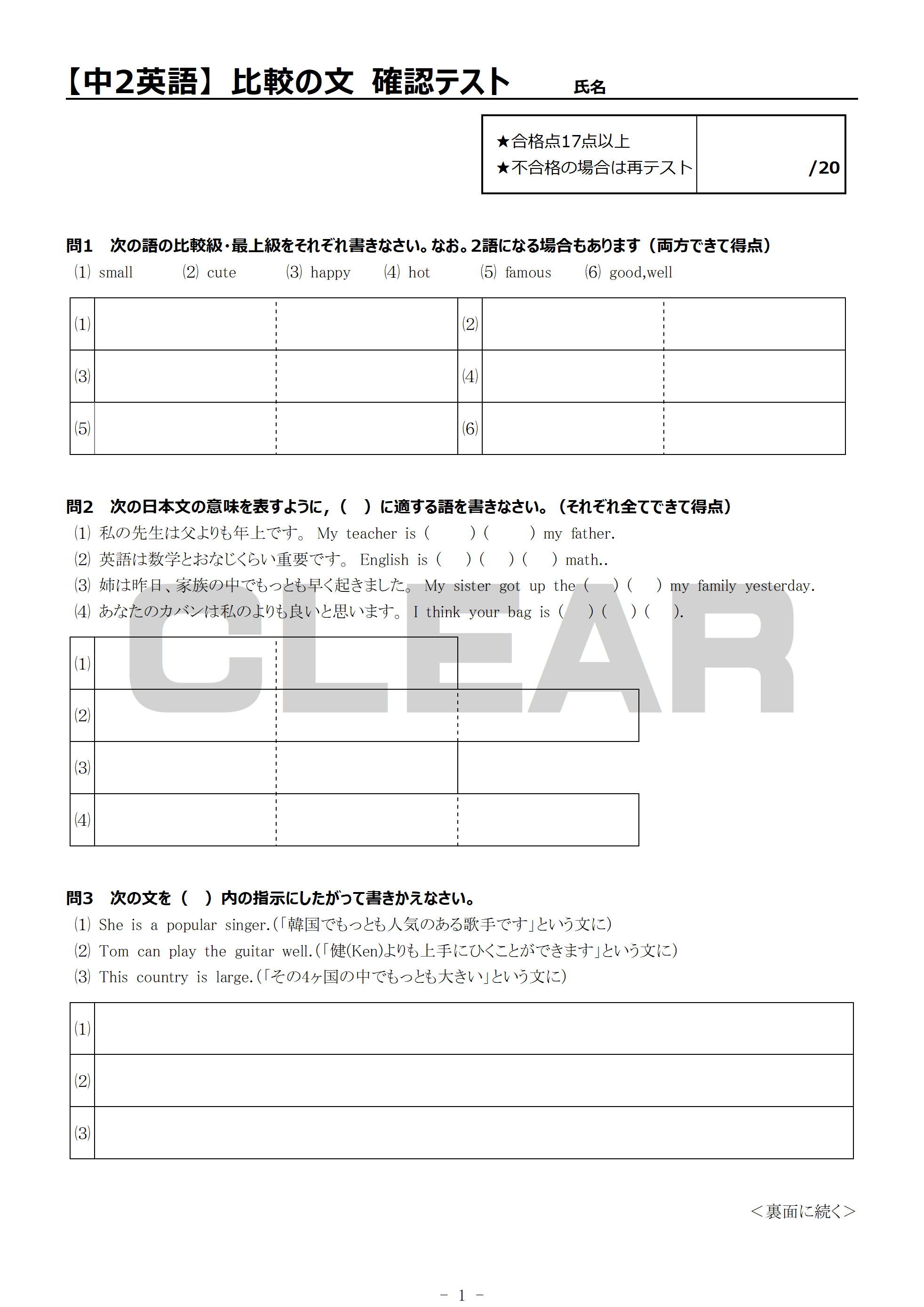 学校の進み具合から受動態は入るか入らないか微妙かな。でも上記のとおりに不定詞、比較、受動態がすべて含まれたら、かなり手強いテスト範囲となる。これまでただでさえ二極化の傾向にあるのに、さらに拍車がかかりそうだ。