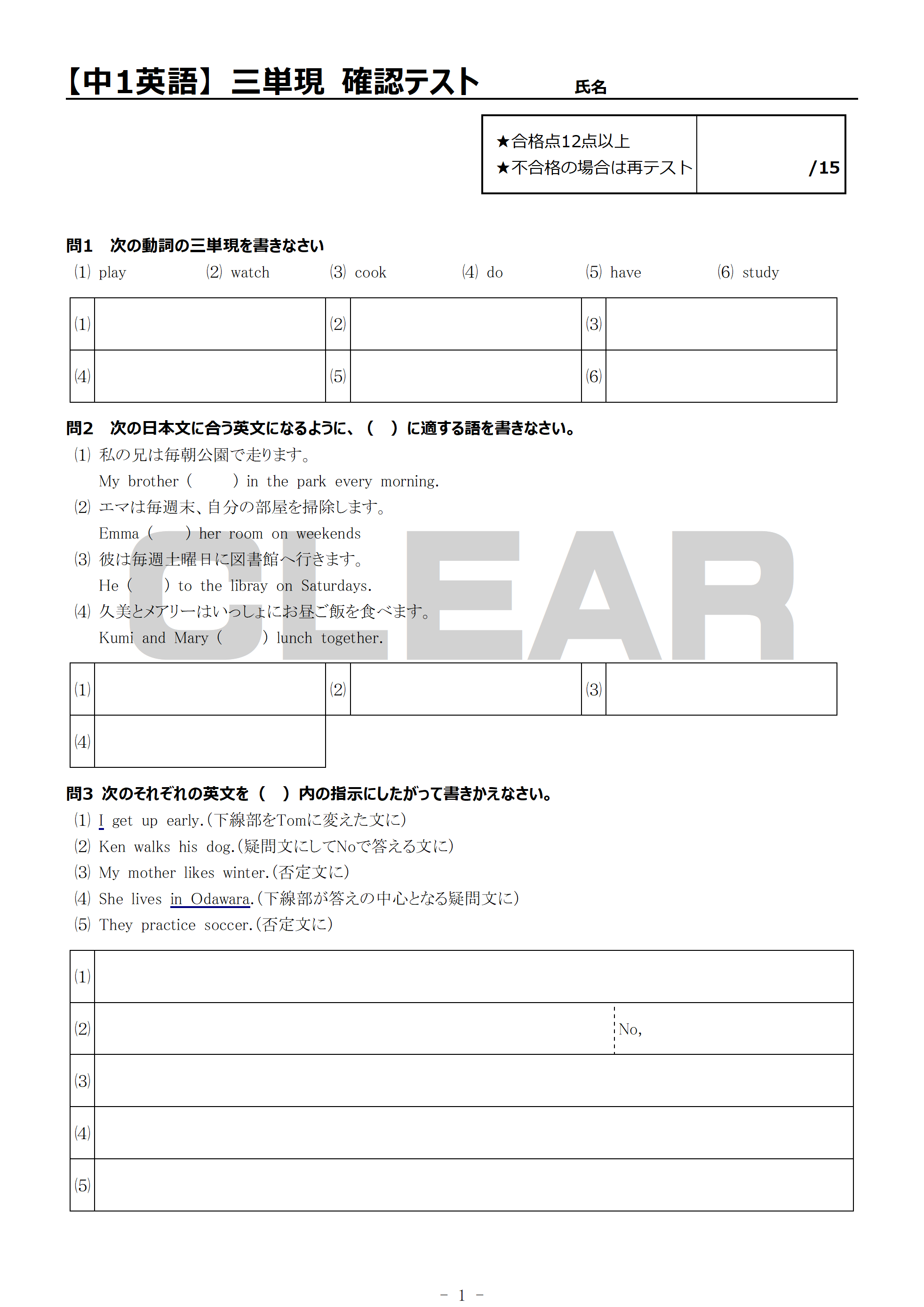 中2同様にかなり手強いテスト範囲となることが予想される。三単現だけでも手を焼くのにこれに過去形や進行形が入ったら、比較的英語が得意な子でも結構苦労するのではなかろうか。学校の進み具合によれば、進行形は入るか入らないか微妙だが。