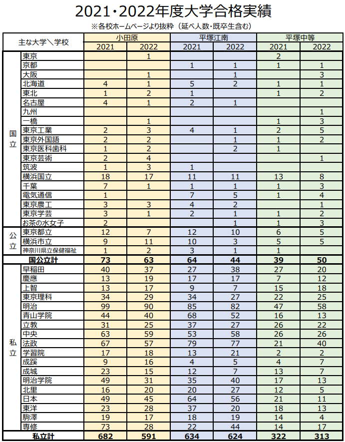 国公立大の中でも最難関といわれる“東京一工”(東大・京大・一橋大・東工大)や旧七帝大(東大・京大・大阪大・北海道大・東北大・名古屋大・九州大)では、小田原、平塚江南はこの2年間だけで比べてみると同程度。国公立は全体的に、小田原は文系寄りの大学がやや多く、平塚江南は理系寄りの大学がやや多いように感じる。私立大は、早慶上理などの最難関大ではやや小田原の方が多いようだ。