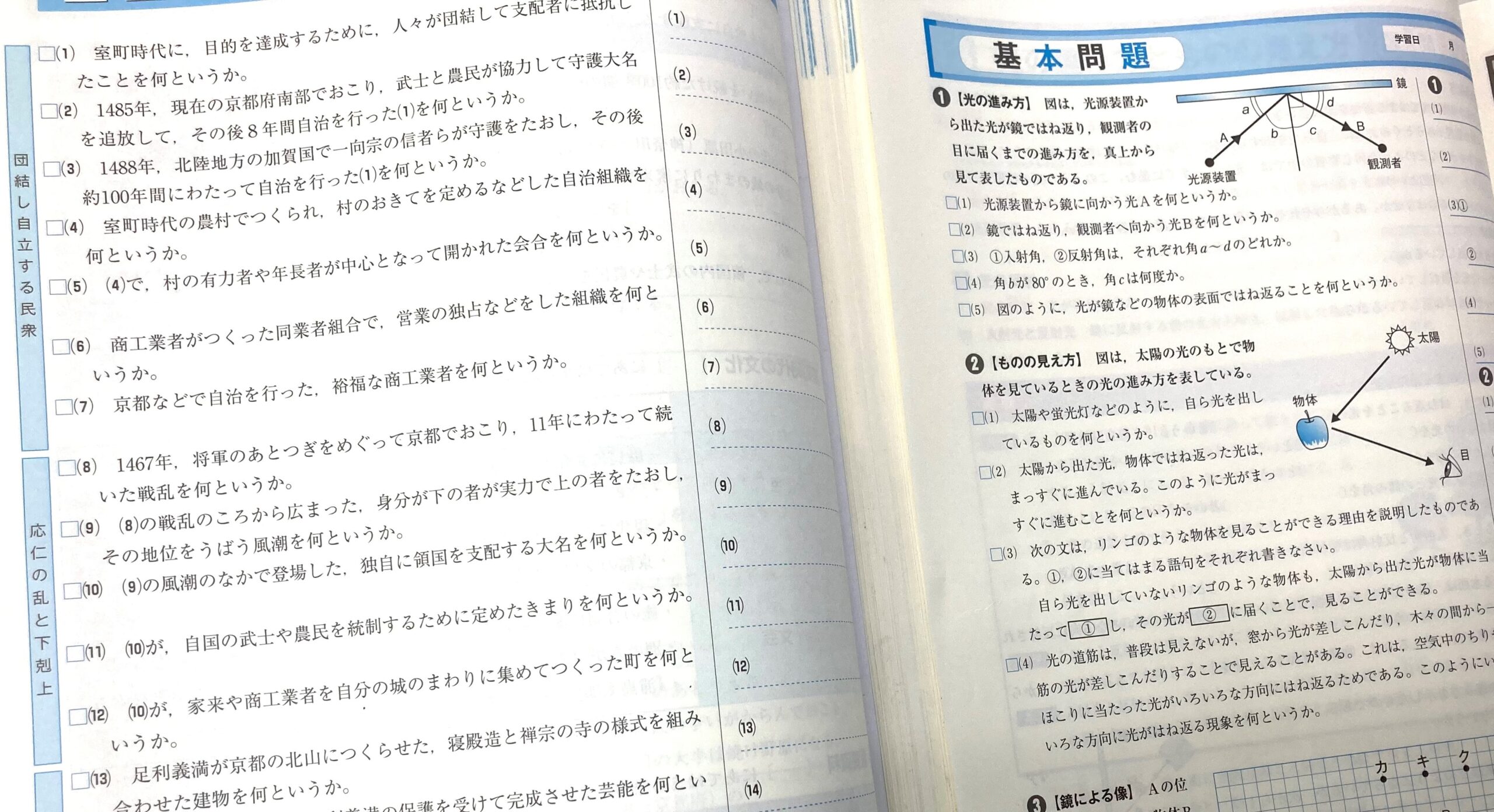 苦手とする分野はそれぞれだが、理科なら物理分野(特に中1で学習した「光・音」)、社会なら歴史(江戸時代まで)を苦手とする受験生が一般的に多い。全ての復習は無理でも、特に著しく理解ができていない分野や単元だけでも、この夏休みを使って一度復習しておいたほうがいい。具体的な取り組みとしては。学校や塾のワーク等にある一問一答的な基本問題で、まずは知識のアウトプットをし直すこと。思考力重視といえども、まずは基礎知識がなければどうにもならない。