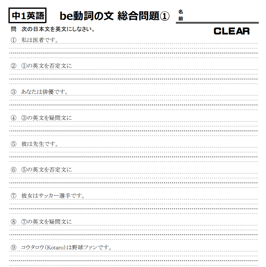 基本となる、I am~. / You are~. / He(She) is~. / This(That) is~. / We are~. / They are~. / These(Those) are~. などを繰り返し繰り返し。現行の教科書では、主語が単数の場合を除くと、これらは体系的に学習する順序とはなっていないため、突然出てきて混乱する子どもたちも少なくない。だから、教科書をしばし離れたのだ。ちなみこれらは全て小学校で“一応は”習ってはいる。でも、定着していないというのがほとんど。