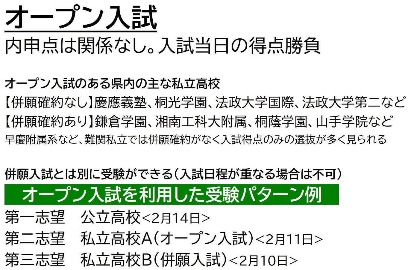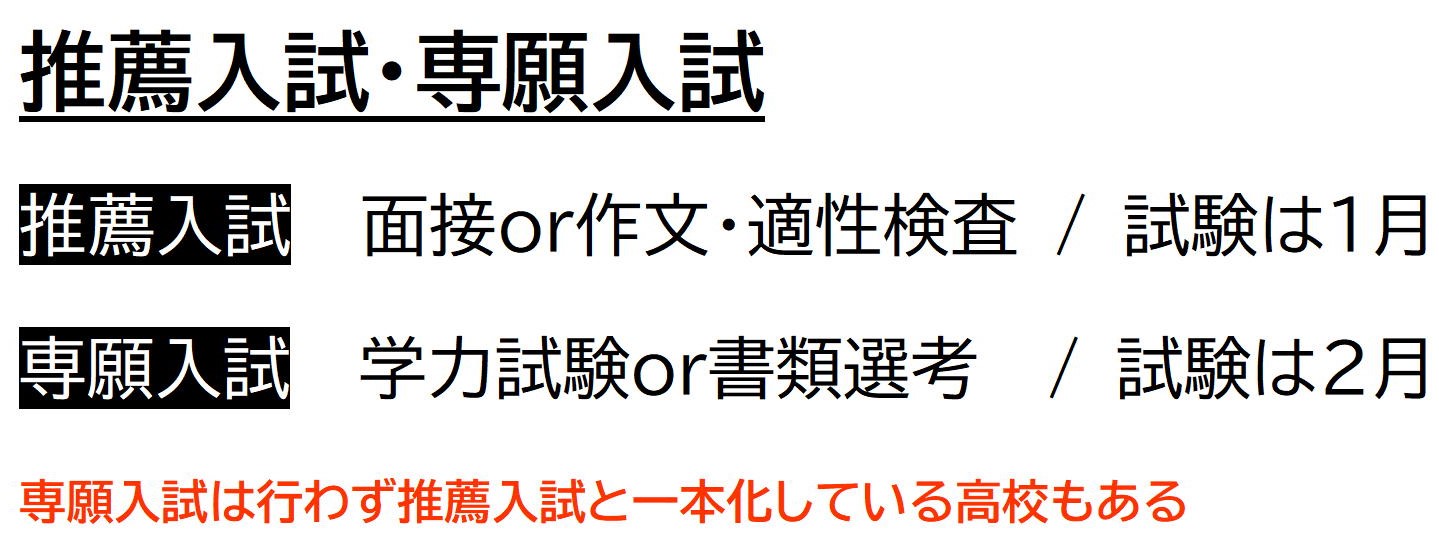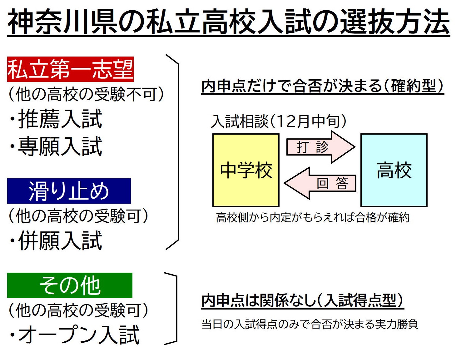 推薦、専願(単願)、併願、オープン。それぞれの概要は上記のとおり。推薦と専願はその私立が第一志望であり他の高校は受験できず、合格=進学となる。併願は基本的には公立を第一志望としている場合の受験パターンだが、他の私立も受験できる高校もある。オープン入試は内申点は一切関係なく、入試当日の得点次第、いわゆる実力一本勝負の入試。