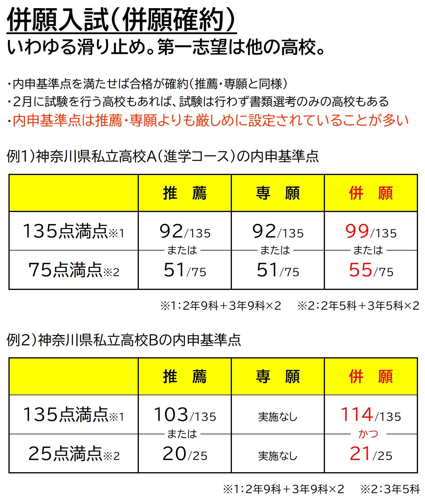 推薦・専願と同じく内申基準点を満たしていれば合格が確約される、併願確約ともよばれる入試。ただし、上記のように推薦や専願よりも併願の方が内申基準点を厳しく設定している高校が多い。