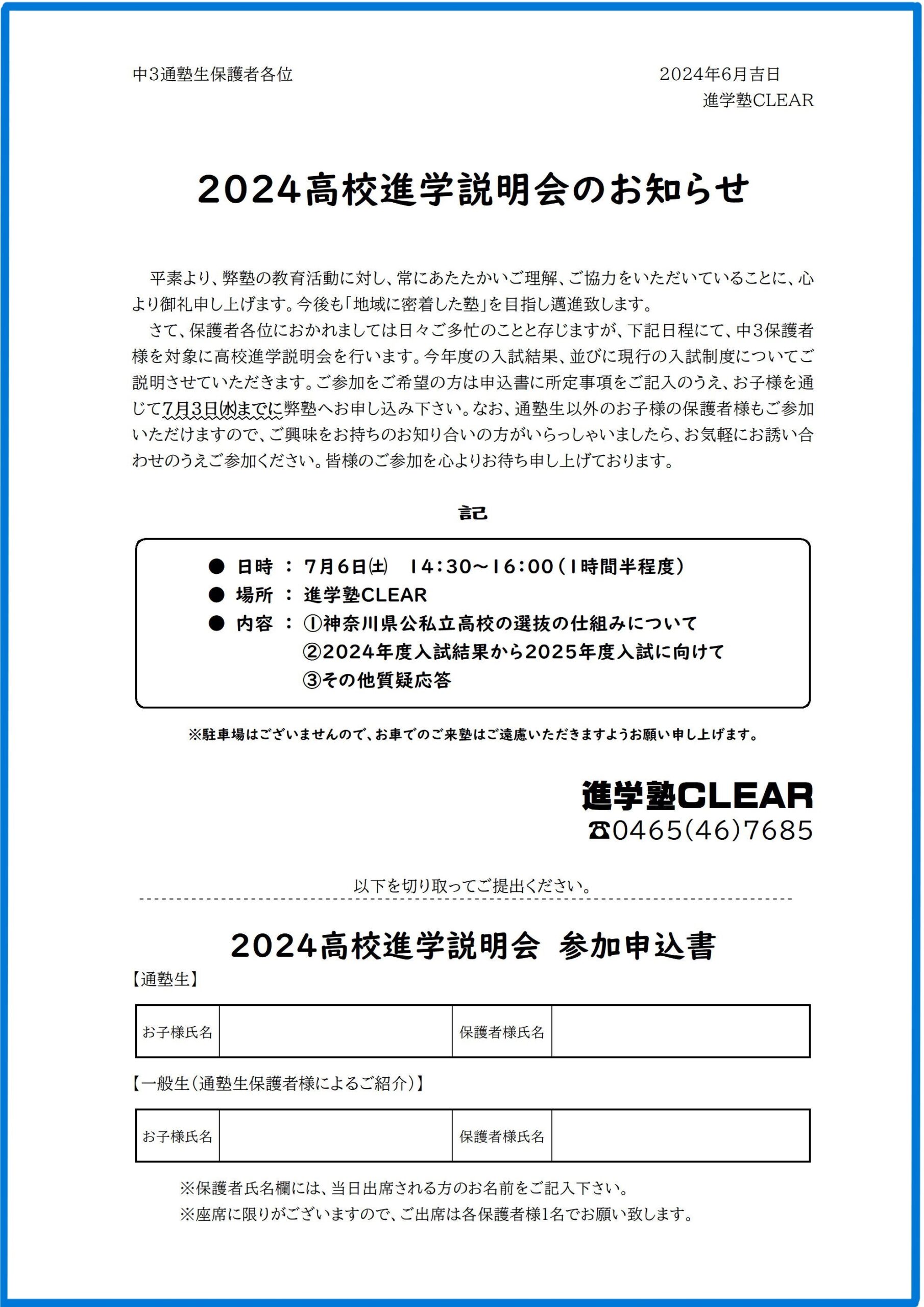 さて弊塾では、7月6日㈯に中3保護者様を対象とした高校進学説明会を開催いたします。