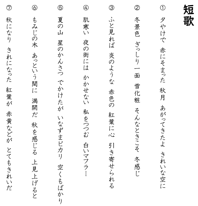 ①短歌は五七五七七、俳句は五七五、それぞれの音数の基本を守ること。