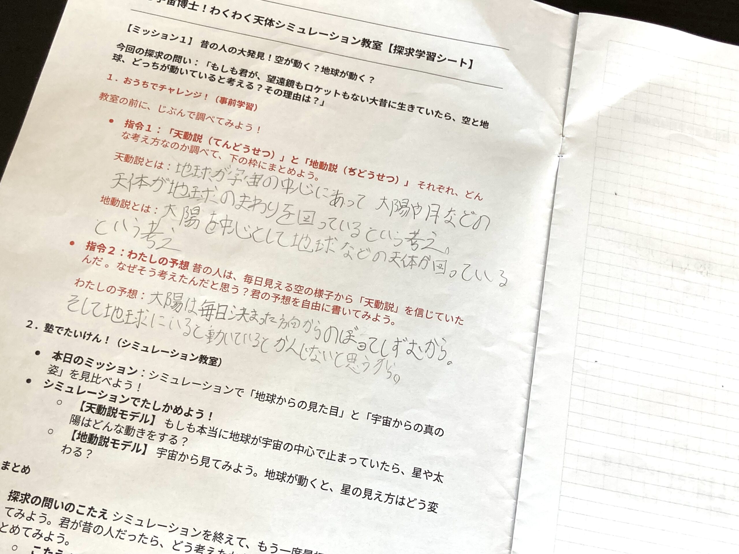 事前教材で予習をしてきてもらった。地動説?天動説?小学生には少し難しい内容も。