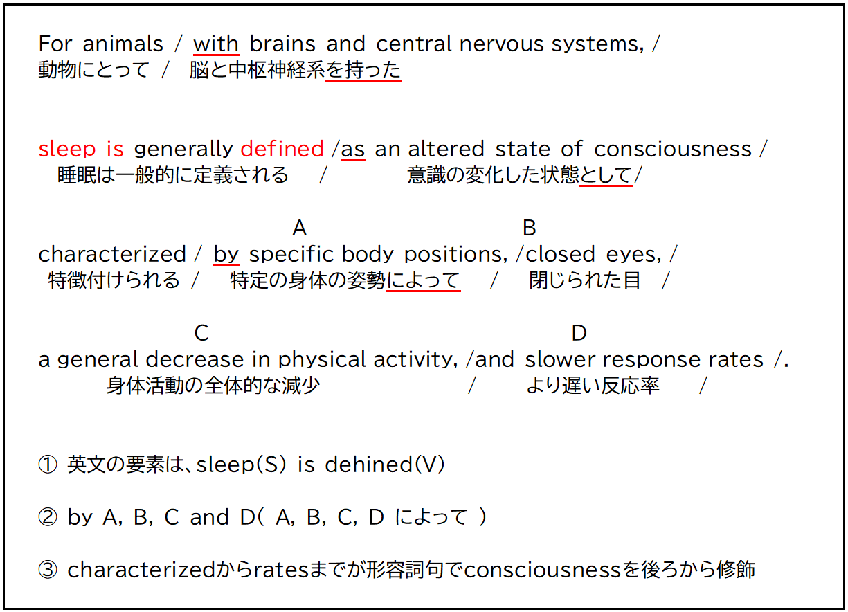 脳と中枢神経系をもつ動物にとって、睡眠は一般的に特定の身体の姿勢、閉じられた目、身体的活動の全体的な減少、より遅い反応率によって特徴づけられる意識の変化した状態として定義される。